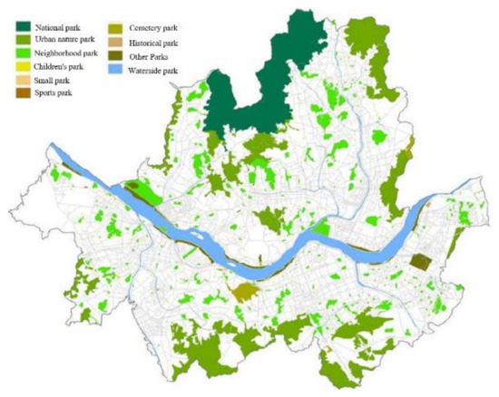 “Parks and Green Space” is a compound phrase comprising “parks” and “green space” [2]. It is a term that encompasses both legally defined parks and green spaces, non-building coverage area or areas around development sites, and open spaces in the natural environment [18].