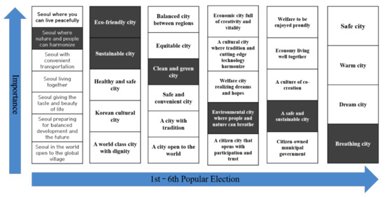 As for Seoul’s parks and green space policies, they were carried out in line with urban policies, until popularly elected mayors were elected. The organizational strength and budgetary allocations were expanded to increase the quantity and quality of parks and green spaces from the first to the fourth term of popularly elected mayors. From the fifth mayoral term, as policies focused more on welfare and citizen participation, the parks and green space policies were promoted while considering resident participation-based programs. Policies have had the greatest influence on policy direction and priorities, depending on the value orientation of the head of a local government [5,49]; policies are determined by political, economic, social, and cultural conditions.
