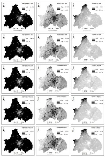 We resampled the NPP-VIIRS NTL data at 1000 m spatial resolution after down-loading the annual data; then, the administrative regionalization mask was employed to extract the nighttime lights images of Chengdu from 2015 to 2019. The annual NDVI and LST data were obtained based on the MVC method following similar research [19]. All three main data were projected to uniform Albers projection with 1000 m resolution.