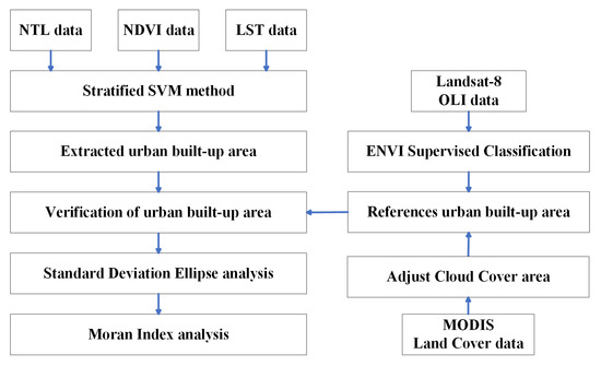 Recently, remote sensing information, such as nighttime stable light (NTL) data, has become widely acknowledged as a new resource to objectively reflect the changes in urban development and the related issues. However, there are two main deficiencies that degrade the accuracy of urban land extracted from NTL data. First, heavy cloud in bad weather constrains the precision of the NTL data [7], which needs to be processed in advance. Second, the overflow effects in the urban core areas limit the accuracy identity of the urban built-up area [8], which needs to be adjusted by other data sources. In response to the gaps above, this paper designed a method to extract the built-up area of Chengdu, a big city in Western China with open access NTL data. In detail, the Suomi National Polar-orbiting Partnership Visible Infrared Imaging Radiometer Suite (NPP-VIIRS) NTL data, the Moderate-Resolution Imaging Spectroradiometer (MODIS) Normalized Difference Vegetation Index (NDVI) data, and the MODIS nighttime Land Surface Temperature (LST) data were utilized, and a stratified support vector machine (SVM) algorithm was applied to gain a better evaluation of the built-up area. Additionally, the refined results of the built-up area were analyzed with Standard Deviation Ellipse (SDE) to track the dynamic change in the built-up area. Finally, the global and local Moran’s I analysis was employed to explore the geographic correlation within Chengdu from 2015 to 2019.