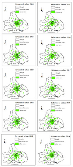 Furthermore, the details of urban extraction results from 2015 to 2019 are listed in Figure 4 below.