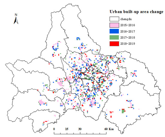 As demonstrated in Figure 5, four different colors indicate the change of extracted urban built-up areas in Chengdu from 2015 to 2019. The pink color pixels, the blue color pixel, the green color pixels, and the red color pixels represent the urban built-up area increase during 2015–2016, 2016–2017, 2017–2018, and 2018–2019, respectively. This can also demonstrate the growth of the urban built-up area in Chengdu during these five years.