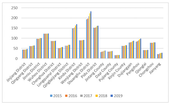 In terms of specific urban built-up areas in 20 different districts in Chengdu, the extracted urban built-up areas are listed in Figure 6 below. All the extracted urban built-up areas of different districts in Chengdu increased stably from 2015 to 2019. However, some districts increased slowly, while other districts increased quickly, for instance, the urban built-up area in Xindu, Shuangliu and Pidu districts grew faster than other districts in Chengdu over the five years. These unbalanced growth of the urban built-up area in different districts can also clearly demonstrate the uneven development between different districts in Chengdu over the five years.