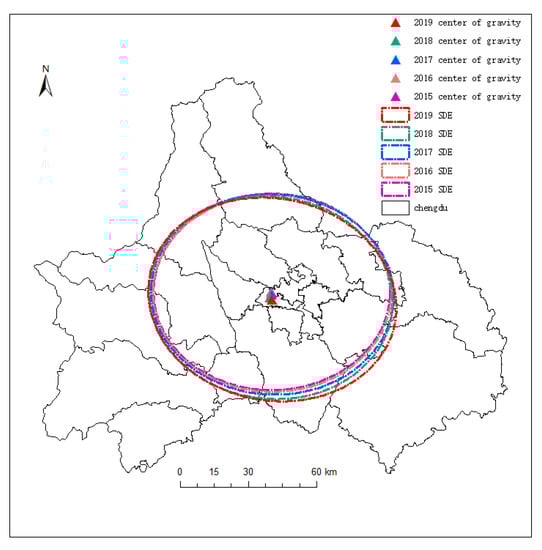 To further analyze the pattern of urban built-up areas in Chengdu over the period 2015–2019, the SDE method was employed to explore the spatial distribution and evolution pattern of urban growth in Chengdu from 2015 to 2019. The details of the SDE method are listed in Table 3, Figure 7 and Figure 8, respectively, as below.