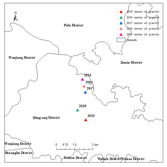 Considering the gravity change in the urban built-up area in Chengdu from 2015 to 2019, as illustrated in Figure 8, all the centers of gravity of urban built-up areas were located in Qingyang district over the five years. In detail, the evolution of the center of gravity mainly followed the north to south direction, and only the center of gravity deviated to the southwest to some extent in 2018, which also reflects the socioeconomic census data over the five years in Chengdu. In addition, the change distance of the center of gravity in 2018 and 2019 was greater than that from 2015 to 2017, which reflected the faster urbanization in 2018 and 2019 in Chengdu.