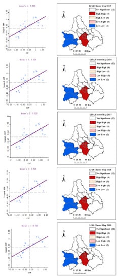 In order to further explore the built-up area change pattern in Chengdu, the spatial autocorrelation analysis method was also employed to study the spatial autocorrelation pattern from 2015 to 2019. In detail, global Moran’s I index, the local Moran’s scatter plot and the spatial local indication of spatial association (LISA) cluster map were employed to unveil the spatial autocorrelation pattern of the urban extension from 2015 to 2019. In addition, the calculated results are demonstrated in Table 4 and Figure 9 as follows. As presented in Table 4, all the p values were significantly lower than 0.001, which not only proves that global Moran’s I index passed the significance test, but also shows that the urban evolution in Chengdu from 2015 to 2019 was clustered. In addition, global Moran’s I indexes were all positive and larger than 0.5, which clearly illustrates a high spatial correlation. Although both the global Moran’s I index value and the z value decreased from 2015 to 2017, both of them increased and were larger than those in 2015, which can demonstrate that the overall spatial correlation became stronger with urban spatial extension, even with fluctuations in some years. Local Moran’s scatter plot and the LISA cluster map were adopted to further investigate the local spatial correlation in 20 different districts in Chengdu from 2015 to 2019; the details are listed in Figure 9.