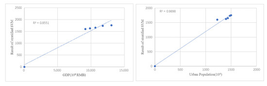 According to related research [16,25,27], socioeconomic census data were also employed to evaluate the accuracy of the extracted urban built-up area over the period 2015–2019 in Chengdu. In detail, the correlation between the extracted urban built-up area and the GDP and the urban population is demonstrated in Figure 11. The relationships between the extracted urban built-up areas, the GDP, and the Population in Chengdu from 2015 to 2019 are discussed; the results demonstrate that the extracted urban built-up areas were highly correlated with the GDP throughout the five years, which clearly shows the accuracy of the proposed urban extraction method. Similarly, the correlation between urban built-up areas and the urban population was calculated in Chengdu from 2015 to 2019; the results illustrate that the extracted urban built-up areas had a strong correlation with the urban population, which also clearly indicates the performance of the proposed research method.