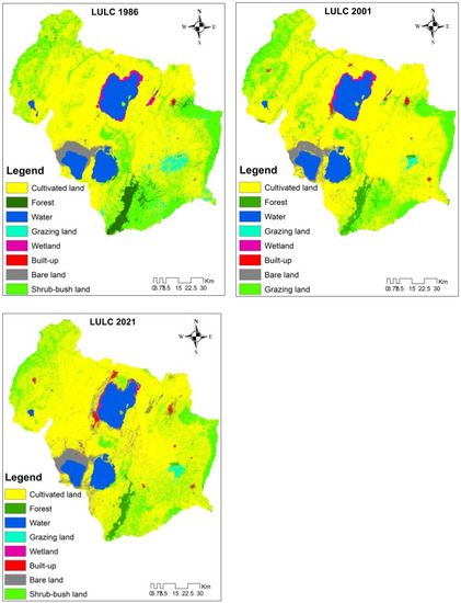 We found that LULC in the area was variable across the study period. From 1986, cultivated lands, shrub-bush lands, and water bodies were found with higher area coverage throughout the study period. Contrarily, forests, wetland, bare, and built-up areas were with the least area coverage. Area coverage of all LULC at the end of the study period, 2021, was not similar to the initial study period, 1986.