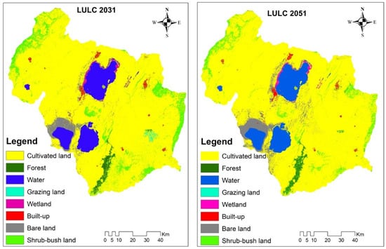 With the exception of cultivated land and bare land, all simulated LULC classes will experience a decline in 2031 and 2051. Drastic transitions of LULC were observed in the periods 2021–2031, 2021–2051. The changes in the most predicted LULC have a similar trend to the observed LULC. Cultivated land and bare land will increase by 2051 as all the other land uses and covers continue to decrease by 2051.