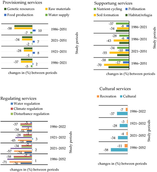 Of all estimated 17 ecosystem services (ES) presented in Figure 4, food production and biological control will increase by 7.6 and 3.1% in 2031, and 7.2 and 1.5% in 2051, respectively. In the years between 1986 and 2021, only food production experienced an increase in ESVf while the rest of ES reduced.