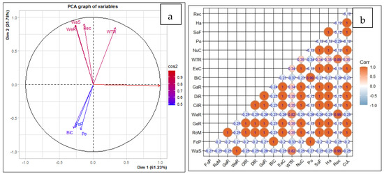 Principal component analysis (PCA) of LULC and different ESs. Note: (a) is an ES (variables) factor map that is labeled ES; those are selected shown on the plane; (b) is a graph that shows the correlations between ESs. Each ES were denoted as follows: Water supply (WaS); Food production (FoP); Raw materials (RoM); Genetic resources (GeR) Water regulation (WeR); Climate regulation (CilR); Disturbance regulation (DiR); Gas regulation (GaR); Biological control (BiC); Erosion control (EeC); Water treatment (WTR); Nutrient cycling; (NuC); Pollination (Po); Soil formation (SoF); Habitat/refuge (Ha); Recreation (Rec); Cultural (CuL).