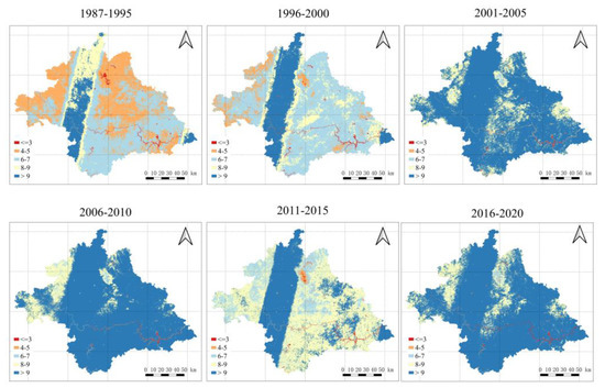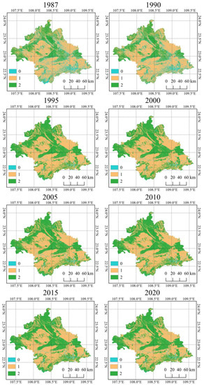 - Zhang, M.; Cao, C.X.; Chen, W. Remotely Sensed Diagnosing Temporal and Spatial Variation of Vegetation Coverage in Guangxi Based on MODIS NDVI Data. Sci. Silvae Sin. 2019, 55, 27–37. Available online: http://www.linyekexue.net/EN/10.11707/j.1001-7488.20191004 (accessed on 14 March 2022).
