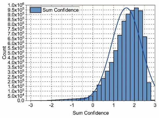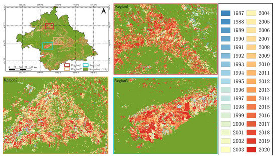 - To further improve the disturbance detection accuracy and precisely record the change time at a monthly scale, the continuous harmonic fitting segments are used to extract the disturbance time. The sum confidence was defined as the sum value of the confidences of NDVI, NBR, and NDFI (Equation (4)). For every breakpoint in the yearly time-series curve fitted by the harmonic model, only the breakpoint with the highest sum confidences of NBR, NDVI, and NDFI was extracted. To eliminate salt and pepper noises, the morphological closing method and the superpixel clustering algorithm are adopted.