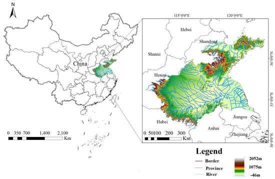 The Huaihe River Basin is located in eastern China, between 30°55′−37°50′ N and 111°55′−122°42′ E (Figure 1). It covers an area of approximately 3.3 × 105 km2 crossing Henan, Hubei, Anhui, Jiangsu, and Shandong Provinces [45]. With a dense population of 600 person/km2, which is far higher than the national population density of 148 person/km2 [37,39]. The main stream of the Huaihe River originates from Tongbaishan Mountain in Henan Province, China, and flows eastward into the Yellow Sea [46]. The topography is dominated by low hills in the western and north-eastern parts of the basin, which cover 1/3 of the total area, and by extensive plains in the remaining 2/3 [47]. The basin is located in the South-North transition zone of China, where the mean annual precipitation and temperature are 883 mm and 11−16 °C [48], which provide a suitable living environment for organisms. With the high-intensity exploitation of resources, ecological systems have been under great pressure, and ecological and environmental problems such as subsidence and degradation of arable land quality are becoming more serious [47].