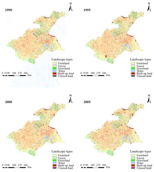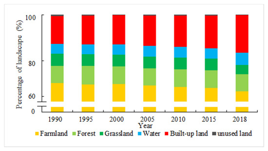 The landscape composition in the Huaihe River Basin during 1990–2018 was obtained according to the landscape type images (Figure 3). The results showed that farmland accounted for the major landscape type in the Huaihe River Basin, covering more than 66% of this area; the second was built-up land, covering more than 12% (except in 1990). The area of forest, grassland, and water were relatively small, and their total coverage in the study area is less than 16%. Combined with landscape change rates at 5-year intervals (Table 1), changes to landscape composition in the study area were characterized by the expansion of built-up land and water, the reduction of farmland and grassland, and forest and unused land were variable. From 1990 to 2018, area percentages of built-up land and water increased from 11.9% to 16.3% and 4.1% to 5.3%, respectively; farmland and grassland decreased from 70.3% to 66.8% and 5.4% to 3.9%, respectively.
