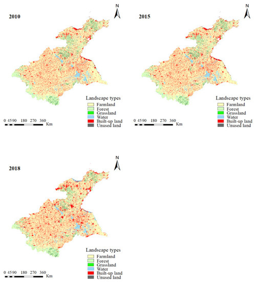 Due to its rapid economic development and abundant natural resources, the Huaihe River Basin has become an important agricultural and industrial base in China [39,42]. In the present study, landscape type composition analysis, a landscape transfer matrix, and landscape indices were used to explore the changing characteristics of landscape patterns driven by human activities and the environment in the Huaihe River Basin from 1990 to 2018.