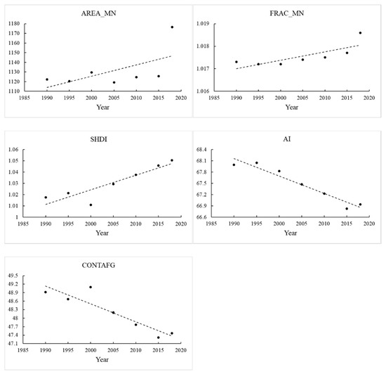 Five landscape indices (AREA_MN, FRAC_MN, SHDI, AI, CONTAG) were used to further quantify the landscape patterns and their changes due to human activities (Figure 4). The results indicated that there was little change in landscape fragmentation until 2015, after which there was a significant decrease. This indicated that the landscape fragmentation shows a trend of first increasing and then decreasing with urbanization [71]. This change may have been due to the development of agriculture and industries. The built-up area greatly increased and led to small patches of built-up land integrated into the large landscape patches (Figure 2). The result of the “Returning Farmland to Forest” policy allowed some sloping farmland to be converted to forest and grassland, making up larger areas of fragmented grassland and forest [8,16,30]. The increased built-up land area fragmented some of the intact natural landscape, resulting in landscape patches gradually becoming more complex and irregular in shape and weakening the connectivity between patches. Meanwhile, the increased land-use intensity resulted in a large amount of grassland, forest, and farmland being occupied and converted into artificial landscapes, which increased heterogeneity and evenness. This finding is generally consistent with previous studies [4,7,32].