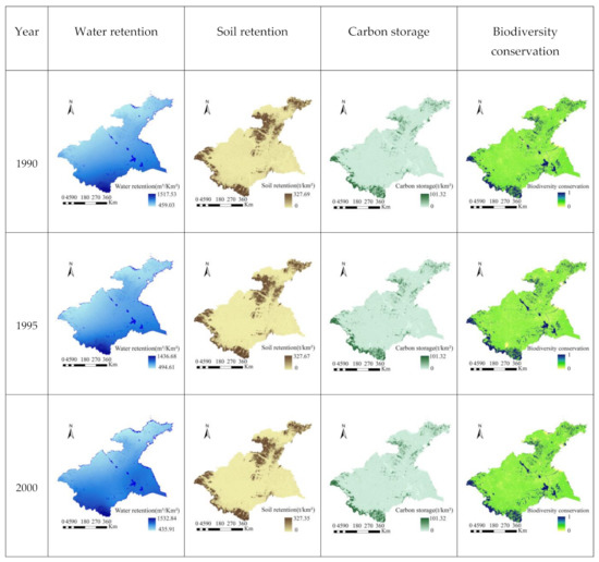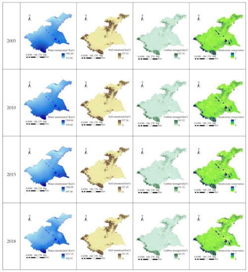 The topographic and climatic conditions of the Huaihe River Basin provide a wide range of essential ecosystem services to human society in the study area, including the supply of freshwater, maintaining biodiversity, soil retention, and carbon storage [53,54,55]. Freshwater supply and carbon storage have a direct influence on human survival [56], and biodiversity and soil retention promote and protect human well-being [8,57]. Taking into account the high-intensity resource development, agriculture, and other human activities that pose threats to the supply of ecosystem services, four ecosystem services were selected for measuring the ecosystem services capability of the Huaihe River Basin: water retention, soil retention, carbon storage, and biodiversity conservation.