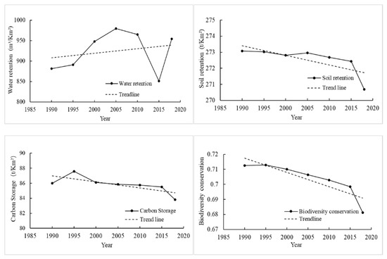 The capacity of ecosystem services in the Huaihe River Basin from 1990–2018.