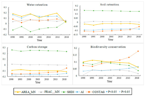 In terms of time, the landscape spatial configuration impacts differed. The results showed that reduced landscape fragmentation and connectivity between patches, increased discreteness, and irregularity of patch shapes had negative impacts on water retention. Reduced landscape fragmentation and increased irregular patch shape negatively impacted carbon storage. Increased connectivity had a positive impact on biodiversity conservation, whereas reduced landscape fragmentation and increased patch shapes irregular had negative impacts. There were no significant correlations between soil retention and the landscape indices, showing that soil retention was not easily affected by landscape spatial configuration. This conclusion is different from previous studies; for example, Li et al. argued that irregular patch shape was positively correlated with ecosystem services [2]. Liu et al. demonstrated that enhanced discreteness was negatively related to provisioning and support services and positively related to regulatory and cultural services [12]. Their research was based on a small scale, whereas this study was based on a larger geographic area, illustrating the impact of scale on results.