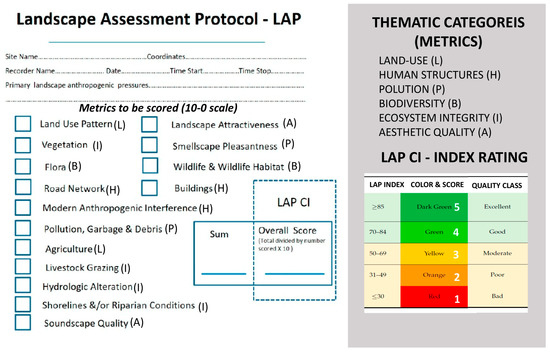 The approach that the LAP applies promotes a merging of the biocentric and sociocultural paradigms in assessment traditions, following the tenets of landscape ecology and the study of landscape history and natural history, incorporating techniques from site-based rapid bioassessment surveys. Indices and rapid assessment approaches have been widely developed for ecosystem monitoring using specific evaluation criteria (such as tested metrics) for over four decades now; most are founded on an understanding of ecological integrity [61]. The rationale for utilizing visible and perceptible metrics onsite is widespread in biologically-based rapid assessments of ecosystem conservation conditions [62]. In contrast to specific ecosystem types, landscapes are often highly dynamic, complex, and heterogeneous “systems”, and when the human aspect enters the framework, there are challenges in systematizing such assessments [63]. As Daniel (2001) [1] purports: “landscape quality derives from the interaction between biophysical features of the landscape and perceptual/judgmental processes of the human viewer”. Through an onsite assessment method, we acknowledge that “quality” is supported by both landscape conditions and the perceptual processes the landscape view “evokes” in the assessor.