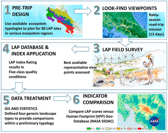 Summary of LAP application in Costa Rica: (1) designing the survey to cover different ecosystem types throughout the country; (2) searching for viewpoint possibilities to apply the LAP; (3) assessing selected landscape views onsite; (4) database, data entry, and index computation; (5) cartographical and statistical analysis; and, (6) insights from the results of other indicators. (Terrestrial ecoregion delineation (step 1) based on Olson and Dinnerstein 2001 [69], retrieved from https://databasin.org/ uploaded by http://consbio.org, accessed on 1 February 2022).
