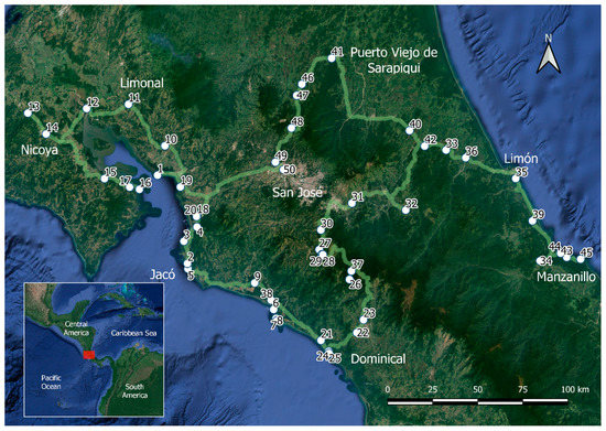 Costa Rica is renowned for its remarkable landscape diversity. A thin and high cordillera with many volcanos creates a central backbone splitting the small country between the Pacific and Caribbean slopes; the highest peak, Cerro Chirripó, is 3819 m above sea level. Most of the country was originally covered by forest. Humid tropical rainforest dominated both west and east of the cordillera, while the northwest had seasonally dry lowland forests and woodlands and the high mountains hosted vast broadleaved cloud forest and highland scrublands [64]. This biological cross-roads of Mesoamerica was inhabited by indigenous First Nations before coming under Spanish rule in the 16th century; for centuries, development was limited to the central plateaus. Costa Rica now has a population of about five million in an area of 51,060 km2. The country has experienced extensive landscape changes during the last five decades, with industrial monoculture expansion (banana, pineapple, palm oil, etc.) in many parts of the country, while coffee and several other fruit trees and garden vegetables are often in mixed landscapes; many traditional small holdings still exist. Landscape changes also involve urban sprawl and expanding road networks; however, there has been widespread recent regeneration of felled forests [65, 66, 67]. Tourism has been a growing industry but is still fairly localized. Efforts for conservation areas and parks began earlier than other tropical Latin American countries [68], with remarkable success (now covering 25% of land and nearly 30% of marine areas). In this survey work, we assessed landscape conditions in no less than six different terrestrial ecoregions (following Olson and Dinnerstein 2002 [69]), in varied landscapes, including coastal, flatland, upland, and urban environments.