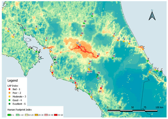 All surveyed sites overlain on the Human Footprint degradation assessment (warmer colors show anthropogenically degraded areas). Each point shows the LAP assessment index in five classes and the general landscape classification in four types (C = coastal, M = mountain, F = flatland, U = urban/peri-urban). The scale and map area in both maps is identical for comparative purposes.
