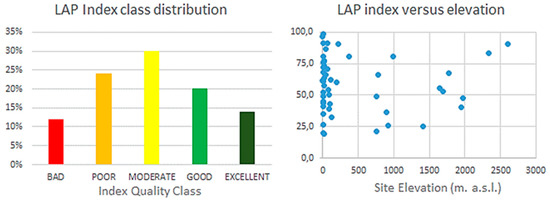 General results and distributions of the LAP survey. Left: Summary of final LAP index class assessments. Right: LAP index scores and elevation; no statistical significance existed for the relation of LAP (Y-axis) versus elevation (X-axis).