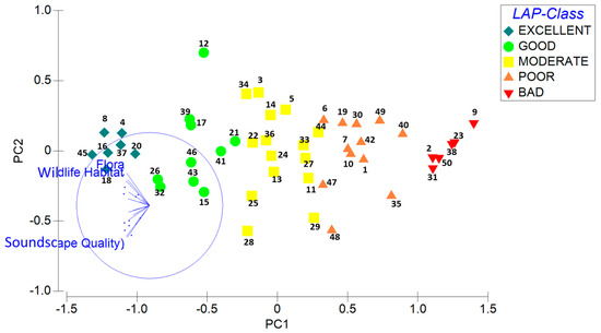 Principal Component Analysis (PCA) was used in order to identify the underlying relations of the metrics, e.g., typological, and to further assess which metrics were dominating the variance of the cumulative LAP score, either in a negative or positive manner. PCA was carried out using standardized metric values of LAP. Standardization was carried out by replacing the missing values with 5.5 and then setting the value 5.5 as 0, and setting the value 10 as 1 on the one end and the value 1 as −1 on the other. The horizontal axis of the PCA accounted for 64.6% of the total variation, whereas the second axis added a mere 6.9%. According to the arrangement of the 50 samples, the horizontal axis was evidently discriminating amongst the samples according to their LAP classification (Figure 7) and not according to the landscape type category; this provides evidence for validating the use of the LAP in very different landscape types. Furthermore, the first axis was most related to the values of Wildlife and Wildlife Habitat, Flora, Soundscape Quality, and, to a lesser extent, Vegetation and Smellscape Pleasantness (Table 4). The metrics of Wildlife and Wildlife Habitat, Flora, and Vegetation presented a high degree of concordance. The PCA shows that it is a multiparameter application, as a few metrics do not dominate.