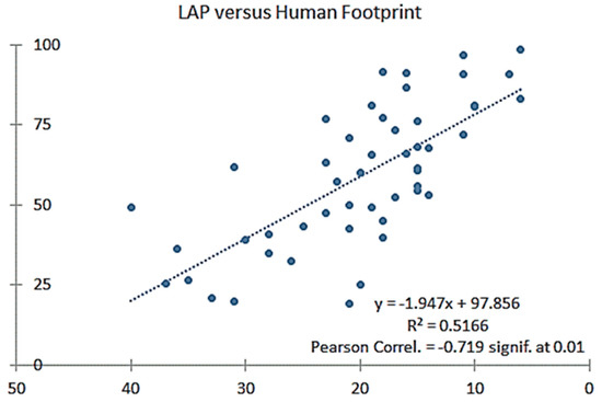 Correlation between the two indices, LAP score on Y-Axis and Human Footprint (HFP) on X-Axis. Note that the score gradient is reversed in the two indices: LAP scores of “0” mean degraded landscapes and “100” mean excellent ones; in the HFP, “0” stands for excellent (no impact) and “50” for the most degraded. Pearson correlation calculates the effect of change in one variable when the other variable changes, from moderately to well correlated in this case.