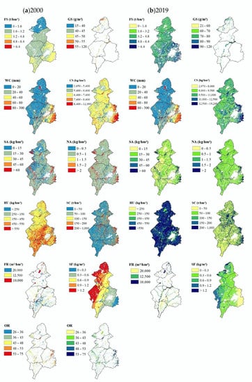 Spatial distribution of ES in Shenyang during (a) 2000 and (b) 2019, food supply (FS), grass supply (GS), water conservation (WC), carbon sequestration (CS), SO2 absorption (SA), NOx absorption (NA), humidification (HU), soil conservation (SC), flood regulation (FR), soil fixation (SF), outdoor recreation (OR).