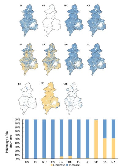 Spatial distribution of increases and decreases in ES during 2000 and 2019, food supply (FS), grass supply (GS), water conservation (WC), carbon sequestration (CS), SO2 absorption (SA), NOx absorption (NA), humidification (HU), soil conservation (SC), flood regulation (FR), soil fixation (SF), and outdoor recreation (OR).