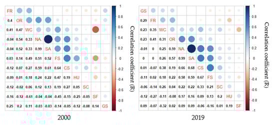 Correlation map of ES in Shenyang during 2000 and 2019, food supply (FS), grass supply (GS), water conservation (WC), carbon sequestration (CS), SO2 absorption (SA), NOx absorption (NA), humidification (HU), soil conservation (SC), flood regulation (FR), soil fixation (SF), outdoor recreation (OR). The blue and red circle indicate positive and negative correlations, respectively.