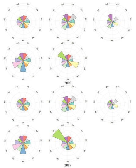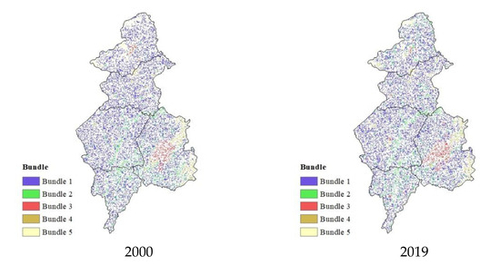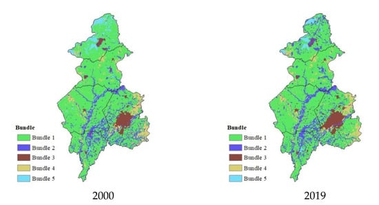 As shown in Figure 5, the contributions of each ES in ES bundle 1 were not significantly different, with humidification contributing the most, followed by carbon sequestration and food supply, and flood regulation contributing the least. It covered the entire city of Shenyang and was the most widely distributed of the five bundles, accounting for 69.91% of the total area in 2000 and 69.33% in 2019. The functions of each ES in this bundle were relatively weak in comparison to the other four bundles, only slightly higher than bundle 3. Except for the decrease in grass supply from 2000 to 2019, all other ES have improved over time, namely food supply, soil conservation, carbon sequestration, SO2 absorption, NOx absorption, humidification, sand fixation, flood regulation, water conservation, and outdoor recreation had a synergistic relationship, while they had a trade-off relationship with grass supply. The functions of flood regulation, water conservation, and outdoor recreation were more significant in ES bundle 2, which were the highest of the five bundles, and flood regulation contributes the most. This bundle was mainly distributed in the central and southern parts of Shenyang near water bodies, accounting for 13.55% and 15.45% of total area in 2000 and 2019, respectively, with an increasing trend, mainly converted from bundle 5. Grass supply, NOx absorption, and sand fixation increased in 2019 compared to 2000, while other ES decreased, indicating that grass supply, NOx absorption, and sand fixation were synergies and trade-offs with food supply, soil conservation, carbon sequestration, SO2 absorption, humidification, flood regulation, water conservation, and outdoor recreation. Overall, among the five ES bundles, ES bundle 3 had the weakest ES function. It was mainly distributed in Shenyang’s southeastern and northern regions, accounting for 4.60% and 5.52% of the total area, respectively. Water conservation contributed the most in 2000, while grass supply contributed the most in 2019. Only carbon sequestration increased from 2000 to 2019, while other ES decreased; that is, each ES in bundle 3 decreased with the increase in carbon sequestration, indicating that they had a trade-off relationship with carbon sequestration. Among the five bundles, ES bundle 4 had the strongest ES function, with SO2 absorption and NOx absorption contributing the most and sand fixation contributing the least. Mainly distributed in the southeastern and northern parts of Shenyang, accounting for 7.60% and 7.89% of the total area in 2000 and 2019, respectively. Compared to 2000, in 2019, grass supply, soil conservation, humidification, sand fixation, flood regulation, and outdoor recreation have increased, while others had decreased, namely grass supply, soil conservation, humidification, sand fixation, flood regulation and outdoor recreation were synergistic, while food supply, carbon sequestration, SO2 absorption, NOx absorption, water conservation were trade-offs. In ES bundle 5, sand fixation and grass supply were the most significant, and sand fixation was the most powerful of the five bundles. Bundle 5 mainly distributed in the northern part of the study area, accounting for 4.33% of the total area in 2000 and 1.80% in 2019. Food supply, carbon sequestration, SO2 absorption, NOx absorption, humidification, sand fixation, and water conservation all improved in 2019 compared to 2000, while others decreased. Specifically, food supply, carbon sequestration, SO2 absorption, NOx absorption, humidification, sand fixation, and water conservation are synergies, while they were trade-offs with grass supply, soil conservation, flood regulation, and outdoor recreation (Figure 4 and Figure 5).