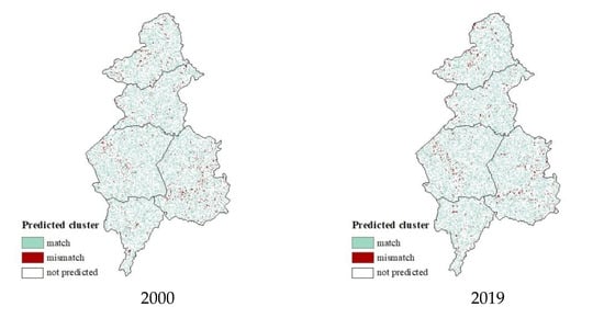 Moreover, we calculated the prediction accuracy of the driving factors on the remaining 30% of the 50,381 grids, and the results are shown in Figure 7 and Figure 8. The prediction accuracy in 2000 was 92.68%, and the inaccurate parts were mainly concentrated in the southeastern and northern areas of the study area. Bundle 1 had the highest accuracy, while bundle 4 had the lowest. The prediction accuracy in 2019 was 92.82%, which showed an improvement over 2000. The inaccurate regions were mainly concentrated in the western and northern parts of the study area (Figure 7 and Figure 8), and bundle 3 is the highest and bundle 4 is the lowest.