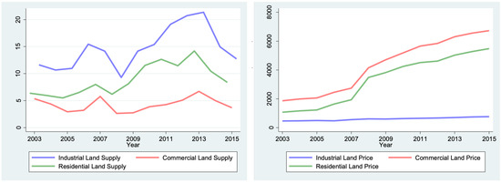 Actually, local governments adopt various strategies to attract investments, such as direct subsidy, relaxed labor and environmental standards, favorable tax rates, and cheap industrial land. To lure footloose manufacturing firms, local governments set up a series of development zones, in which plentiful low-price land and complete infrastructure are provided. By 2006, there were 6015 development zones in China or about two for each county [15]. We collect the supply and price of industrial land, commercial land, and residential land from 2003 to 2015. Obviously, local governments oversupply industrial land with low-price. The amount of supplied industrial land is much higher than residential and commercial land. In contrast, the price of industrial land increased at a slow pace from 469 to 760 CNY/m CNY during 12 years, while the price of commercial and residential land skyrocketed nearly 500% (see Figure 2). Using cheap land for jurisdiction competition effectively depressed production costs and turned China into the world’s workshop [16].