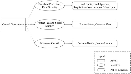 The contributions of this paper to the existing literature are twofold. First of all, this paper speaks to the literature on centralization/decentralization in China studies. Many studies have noticed that the central-local relation is essential to understand the transitional economy in China. Market-preserving federalism theory, for example, argues that the political and economic decentralization has led to a stable central-local government relation and laid the foundation for economic success in China [10,11,12]. Distinct from their general discussions, we focus on a specific and important field, namely the land system, and enrich the relevant literature by uncovering the similarities and differences in decentralization/centralization happened in the land system. Second, this paper provides a new perspective to understand China’s land system. Most studies on land use have focused on the local administrative levels. For example, Zhu noticed China’s gradual urban land reforms since 1984 led to the formation of pro-growth coalition between local government and local enterprises [13]. However, the role of central government has not been fully discussed. Furthermore, there are few studies incorporating both local and central government to analyze China’s land system, not to mention discussing their interaction and its consequences on land use policies. Our study endeavors to make up these gaps by providing a unified theoretical framework called “limited decentralization”, in which we both analyze the incentives and behavior of local and central government and investigate how their interaction contributes to the formation of land policies.