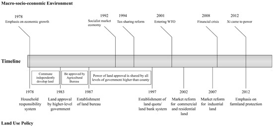 Since the establishment of the People’s Republic of China in 1949, a socialist public ownership of land was introduced. Based on the ideology that all land was public property, land reform became one of the most paramount tasks when the Chinese Communist Party (CCP) came to power. The nationalization of urban land, corresponding with the collectivization of rural land and gradual abolition of private land ownership, laid the groundwork for the current land system in which urban land is owned by the state and rural lands are owned by village collectives. Under such an arrangement of property rights, there is no transaction of land ownership between individuals. However, with the economic reform and ideology liberation initiated by Deng Xiaoping, the land use rights system, learned from the land leasehold system in Hong Kong, was formed to accommodate the needs of foreign direct investments [1]. Since then, the land market has gradually formed and played an important role in China’s economy [2].