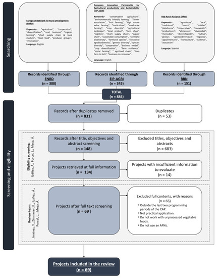 In order to standardize the process of searching for innovative projects in the agri-food sector funded by EU Rural Development Programs, we devised a specific review protocol that was customized to our needs. This was based on the general approach established by PRISMA 1 2020 [45] and other earlier project review studies of a similar nature to ours, such as those carried out by Koumpuros and Georgoulas [46], Zasada et al. [47], Guimarães et al. [48], Petra Herout and Elisabeth Schmid [49] or the European Food Safety Authority [50].