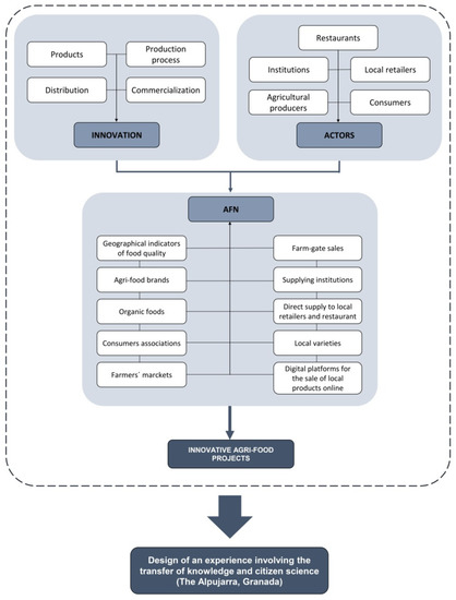 This research offers a systematic review of successfully implemented projects in the agri-food sector funded by EU Rural Development Programs. Our review has three main objectives: (i) to identify the main innovations in the different phases of the food chain within the framework of these projects; (ii) to highlight the organizational methods applied through AFNs to overcome the limits of the conventional system for the sale and distribution of food products; and (iii) to use the knowledge generated by these practical experiences to create a model for the transfer of this knowledge and citizen science that could be applied in the Alpujarra de Granada (Spain), thereby facilitating the design of a specific project for the development of the agri-food sector based on the recovery of local crop varieties.