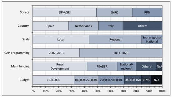 The notable lack of projects in Eastern European countries is also striking given the important role played by the agricultural sector in their economies. If we consider the group of projects as a whole, including the three databases consulted, the database from which most projects were obtained was the EIP-AGRI, which produced almost half the cases (49.3%), followed by the ENRD European database (27.5%) and the RRN (23.2%). Most of the projects were implemented during the CAP 2014–2020 programming period, which concentrated 63.7% of the cases, in particular, the year 2014, in which 24.64% of all the projects were started. The most frequent territorial scale on which the projects were implemented was local (43.5%), followed close behind by those at regional level (40.6%). The least common scales were supra-regional and national, whose combined total came to just 15.9%. As regards the source of funding, most projects received funding from European funds such as the Rural Development 2014–2020 for Operational Groups (42%) and FEADER (23.2%). Funding of up to EUR 100,000 (total budget) was provided in 31.9% of the projects and between EUR 250,000–500,000 in 20.4%. Very few projects obtained funding of one million euros or more (7.3%). This information is set out below in Figure 4.
