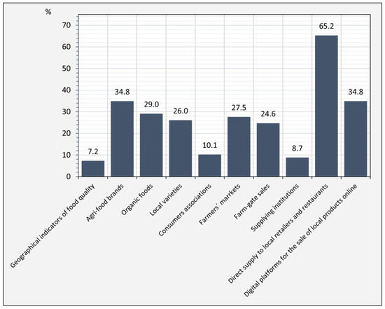 As regards the field of application, we found that 43.5% of the projects were designed and implemented at a local scale, and 40.6% at a regional level. Projects designed at these scales dovetail well with the widespread aspiration of linking product quality and differentiation to the values and identity of the territories in which they are produced. They also tie in well with the increasing demand for locally sourced products that avoid the need for a long distribution chain with large numbers of intermediaries [68,69,70]. Many of the alternative food networks involve the direct sale of products at the farm itself or in farmers’ markets, or through small retailers or restaurants within the local and regional area.