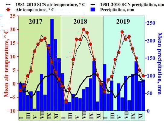 The data presented in Figure 1 for the study period from 2017 to 2019 suggest differences in weather conditions relative to the standard climate norm (SCN). Averaged across the growing seasons, the air temperature was higher in the 2018 and 2019 years of the study compared to SCN (4.0 °C in May 2018 1.8 °C in June 2018, 2.1 °C in July 2018, 2.6 °C in August 2018 and 4.6 °C in June 2019, and 1.2 °C in August 2019). However, total precipitation during the plant growing seasons showed significant variations, especially during May 2017, when a 41.9 mm decrease in total precipitation compared to SCN was reported, and during the May 2019 growing season, when the total precipitation increased by 30.0 mm compared to the standard climate norm. In summary, for temperature and precipitation regimes, the weather conditions in 2017 were cool and wet; in 2018 and 2019, the conditions were warm and dry.
