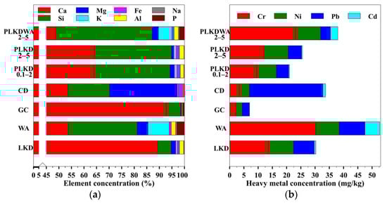 LKD chemical composition typically varies and depends on the source and the process of lime being processed []. The typical composition of LKD varies from 31 to 55% CaO, 0–26% of free lime, 1.7–9.9% SiO2, 0.7–4.1% Al2O3, 0.03–0.22% K2O, and 0.5–25% MgO []. Figure 2a shows the chemical composition of the main nutrients present as well as alumosilicates measured in liming materials. The liming materials chiefly comprised Ca-containing compounds, with Ca accounting for 20% to 41% by weight of the measured nutrients. Other major plant nutrients, such as Mg and K, did not contribute significantly to the overall composition in CD reaching up to ~10%. Fe is an important micronutrient in small amounts needed to sustain plant growth and reproduction []. Alkaline soil, however, binds Fe and causes plant iron deficiency as it is immobilized and unavailable for plants []. The concentration of heavy metals in liming materials is shown in Figure 2b. Low levels of Cd were obtained in GC, CD, and PLKD without WA. In PLKDWA, the amount of Cd was 2.63 ± 0.120 mg/kg, and it slightly exceeded the allowable limit of 2 mg/kg according to EU Regulation 2019/1009. The higher Cd content in PLKDWA was due to the high concentration of 5.21 ± 0.134 mg/kg Cd in wood ash. The highest concentration of Pb (25.8 ± 0.21 mg/kg) compared to other liming materials was found in CD but did not exceed the 120 mg/kg allowable limit. Ni and Cr contents in liming materials also did not exceed allowable limits. Summarily, this work showed that most of the heavy metals measured were detected within concentrations lower than those defined in the regulatory documents describing fertilizers as well as liming materials for soil use. Hence PLKD and PLKDWA can be utilized as a source of liming material.