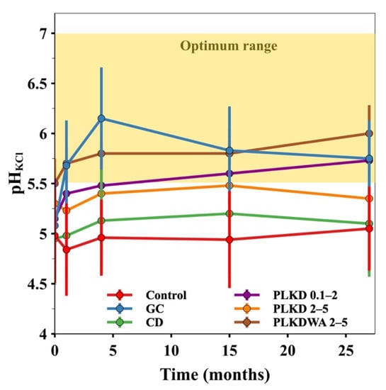 Liming has been widely recommended to manage soil acidification and improve plant yield and soil agrochemical parameters. The available reports suggest that crop yield can be increased using liming due to the improvement in the resulting soil’s physical, chemical, and biological properties [,,]. The soil pHKCl in all experiments was ~5 before liming. The optimal soil pHKCl range needed for plant growth is provided in Figure 3 and is between 5.5 and 7 [,]. Table 3 shows the pHKCl values after liming.