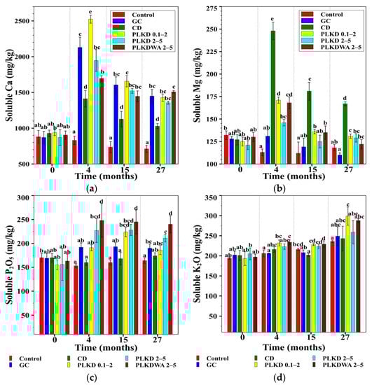 Before liming, soluble Mg content in soil was low at around 130 mg/kg, as shown in Figure 4b. The largest increase in soluble Mg in the soil after liming was found with applied CD because it has the highest Mg content of 10.3%. However, liming with PLKD 0.1–2 and PLKDWA 2–5 also resulted in a statistically significant (p ≤ 0.01) increase in soluble Mg in the soil after 4 months and significant (p ≤ 0.01) after 15 months. Similar to Ca, after 27 months of liming with PLKD and PLKDWA 2–5, a statistically significant (p ≤ 0.01) increase in soluble Mg was observed when compared to GC. Notably, soluble Mg is best absorbed by plants when the ratio of soluble Ca and soluble Mg is 1:5–8. When CD was applied, this ratio was 1:6 and was suitable for plants to absorb the soluble Mg. For other liming materials, the ratio was higher than 1:8 and the absorption of soluble Mg was blocked by Ca ions due to the antagonistic competition between Ca2+ and Mg2+ ions for cation exchange sites [].