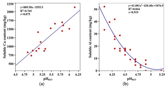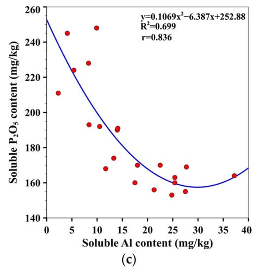 Soluble Al concentration in the soil before the liming experiments was high or very high and varied in a wide range from 17.1 mg/kg to 52.14 mg/kg. The average soluble Al concentration before the application of liming materials was 24.4 ± 14.07 mg/kg. For the control treatment with no liming, the soluble Al content in the soil after 27 months increased from 24.4 ± 14.07 mg/kg to 37.2 ± 18.97 mg/kg. After liming in treatments where pHKCl changed to 5.0 or higher, no soluble Al in soil was detected. Hence, liming reduced soluble Al content in the soil. Soluble Al concentrations were strongly affected by liming and exhibited a high negative nonlinear (polynomial) correlation with soil pHKCl, as shown in Figure 5b. Soluble Al has a toxic effect on plant roots. The roots become poorly developed and weak. When there is an excess of soluble Al in the soil, plants hardly absorb P, Ca, S, and other elements. The relationship between soluble P2O5 and soluble Al was also found in this work to be described with a negative polynomial curve (r = 0.836) (Figure 5c). Similarly for other soils, Mrvić et al. observed a strong negative (r = 0.952) non-linear correlation between exchangeable Al and soil pH values in Stagnosols []. Moreover, Moir and Moot’s research showed similar results to the relationship between exchangeable plant-available Al and soil pH in Brown soils [].