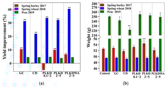 (a) The yield of spring barley, spring wheat and peas; (b) 1000-grain weight of spring barley, spring wheat and 1000-seed weight of peas. * and ** indicate significant differences according to Fisher’s least significant difference test. Statistically significant at * p < 0.05 and ** p < 0.01 level.