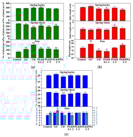 (a) The number of plants per square meter of spring barley, spring wheat, and peas; (b) the spike length of spring barley, spring wheat, and plant length of peas; (c) the number of grains per spike of spring barley, spring wheat, and the number of seeds per pod and number of pods per plant of peas. * and ** indicate significant differences according to Fisher’s least significant difference test. Statistically significant at * p < 0.05 and ** p < 0.01 level.